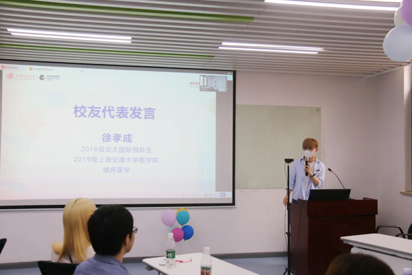 会上,三位预科校友也作为代表上台发言。2019级国际预科生,现就读于上海交通大学医学院的徐孝成同学,作为第一批来交大预科就读的马来西亚国中生,跟大家讲述了他来华留学的经历。他在发言中称,很怀念在交大预科学习生活的一年,感谢老师们对同学的关心。目前正在瑞金医院实习的他对来华留学的未来充满信心,也希望更多马来西亚国中生选择来华留学,选择交大预科。